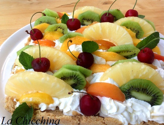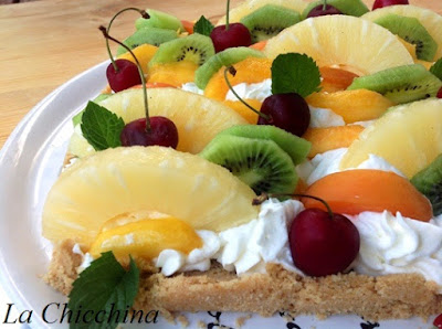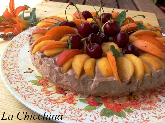 e disporre secondo il gusto la frutta che preferite. Mettere il dolce nel congelatore per almeno due ore. Tirare fuori dal congelatore dieci minuti prima di consumarlo alla salute (si spera) della Chicchina!