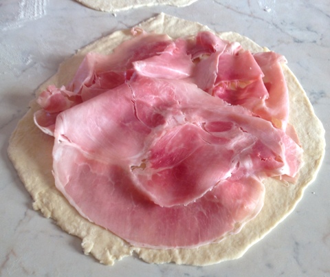 stenderle in uno spessore di 2 millimetri e formare due cerchi delle dimensioni della padella scelta per la cottura (io ventisei centimetri). Appoggiare sul primo disco di pasta il formaggio tagliato a fette sottili, quindi distribuire il prosciutto cotto.
