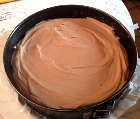 Fare ora raffreddare in frigorifero, in modo che si solidifichi.Ora pensiamo alla crema: ammollare la colla di pesce in acqua fredda per dieci minuti.Sciogliere il cioccolato a bagnomaria e farlo raffreddare.Montare la panna (mi raccomando che sia ben fredda): quando è quasi soda aggiungere lo zucchero a velo.Strizzare la colla di pesce e scioglierla su fuoco dolce,in due cucchiai di panna tenuti da parte dalla quantità prevista: farla dunque raffreddare.Quando il cioccolato fuso é completamente freddo aggiungerlo alla panna, sbattere sino a che é completamente amalgamato e aggiungere anche la colla di pesce sciolta.Riprendere ora la base di biscotto, distribuirvi la crema