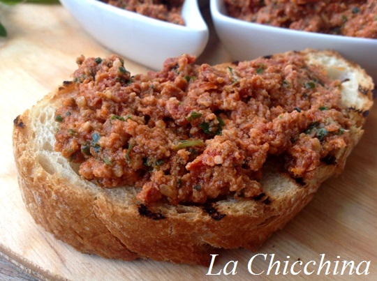 In queste sere d’estate è bellissimo mangiare in giardino. Mi sembra il posto più bello del mondo, ma purtroppo anche le zanzare la pensano così…e allora preparo delle cosine sfiziose e leggere da mangiare velocemente prima che i fastidiosi insetti divorino la famiglia, nonna compresa! Le bruschette sono la soluzione ideale e, in particolare queste, piacciono tantissimo alla famigliola. Il pesto di pomodori è veloce, saporito ed appetitoso. Le dosi riportate di seguito sono assolutamente personali: la preparazione è facile e quindi, bando alle ciance, lo prepariamo insieme?