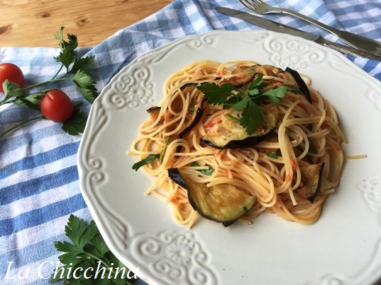 La prima cosa da fare è tagliare a fette spesse circa 1 centimetro le melanzane, cospargerle di sale e metterle a spurgare sotto un peso perché perdano il liquido amaro. Nel frattempo tritare finemente la cipolla e farla soffriggere dolcemente nell’olio. Quando è appassita aggiungere la polpa di pomodoro; salare, inserire il peperoncino, l’origano, i capperi e lasciare cuocere dieci minuti; da ultimo aggiungere il prezzemolo. Sciacquare le melanzane, infarinarle da entrambi i lati e friggerle in abbondante olio fino a quando sono croccanti; metterle poi su carta assorbente perché perdano l’unto in eccesso. Lessare gli spaghetti in abbondante acqua salata; scolarli al dente e metterli direttamente nel tegame del sugo. Aggiungere il parmigiano e le melanzane fritte a pezzettini(meno alcune che useremo per la decorazione dei piatti) Da ultimo spolverare con parmigiano a piacere. Ecco un piatto semplice e buonissimo!!! Grazie di essere stati ancora con me, io vi aspetto sempre qui! Ciao