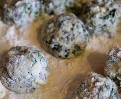 Mescolare sino ad ottenere un impasto morbido ed omogeneo.Trasferire ora il composto sul piano di lavoro infarinato, formare gli gnudi staccando delle palline del peso di circa venti grammi ed infarinarle una ad una.
