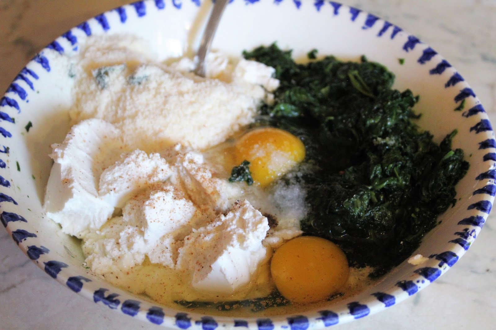 Procedere allo stesso modo anche per la ricotta che, così facendo, perde il suo siero.Dopo questo tempo tritare gli spinaci con la mezzaluna.In una grande ciotola mettere dunque gli spinaci, la ricotta, il parmigiano, la farina, le uova: salare, pepare e profumare con la noce moscata.
