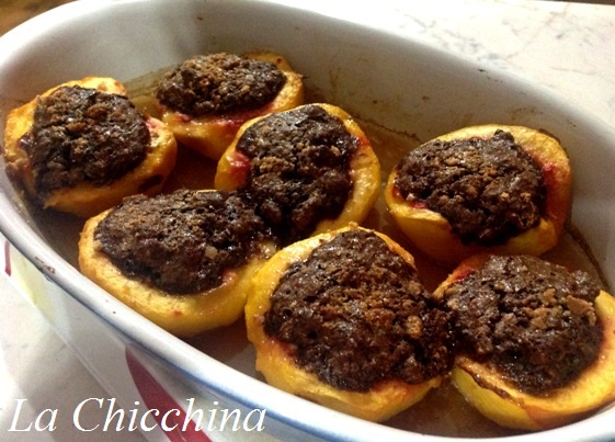 -200 gr di polpa di pesche al netto degli scarti-50 gr di gocce di cioccolato fondente (in alternativa cioccolato tritato grossolanamente)-12 amaretti