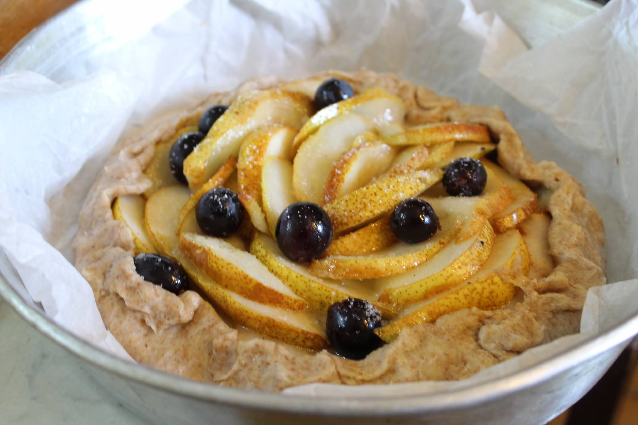 La galette è uno squisito dolce francese, tanto buono quanto semplice da realizzare: si tratta di un “guscio” di pasta briseé riempito con frutta a piacere, è perfetto a colazione,a merenda oppure quando si ha bisogno di una pausa golosa e leggera.Io, oggi, ho scelto di realizzare la mia galette con delle pere succose e uva del mio giardino, mentre il guscio l’ho preparato con farina bianca e farina integrale in ugual misura.Se la frutta è matura e di consistenza morbida, basterà affettarla (senza eliminare la buccia) e metterla a macerare per un’ora con zucchero, cannella e buccia di limone: per frutta con polpa più consistente (ad esempio, mele) sarebbe preferibile cuocere brevemente in padella per ammorbidirla un pochino.Vi consiglio assolutamente di provare questo dolce e, sono certa, che anche voi lo troverete buonissimo…Quindi dai, allacciamo il grembiule e tutti in cucina a preparare la galette con pere e uva…