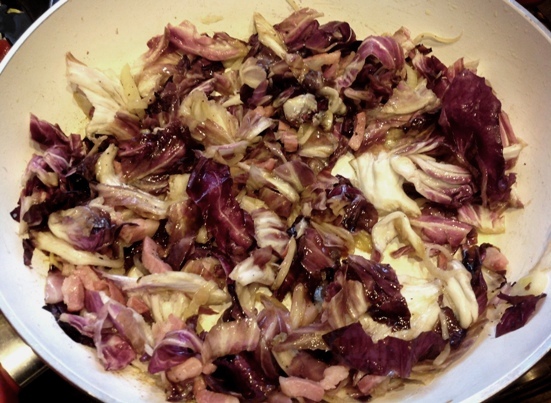 Preparazione: lavare molto bene il radicchio, spezzettare le foglie. In un tegame rosolare la pancetta; aggiungere la cipolla tritata finemente e farla appassire. Inserire ora il radicchio, salare, pepare e lasciare stufare pochi minuti.