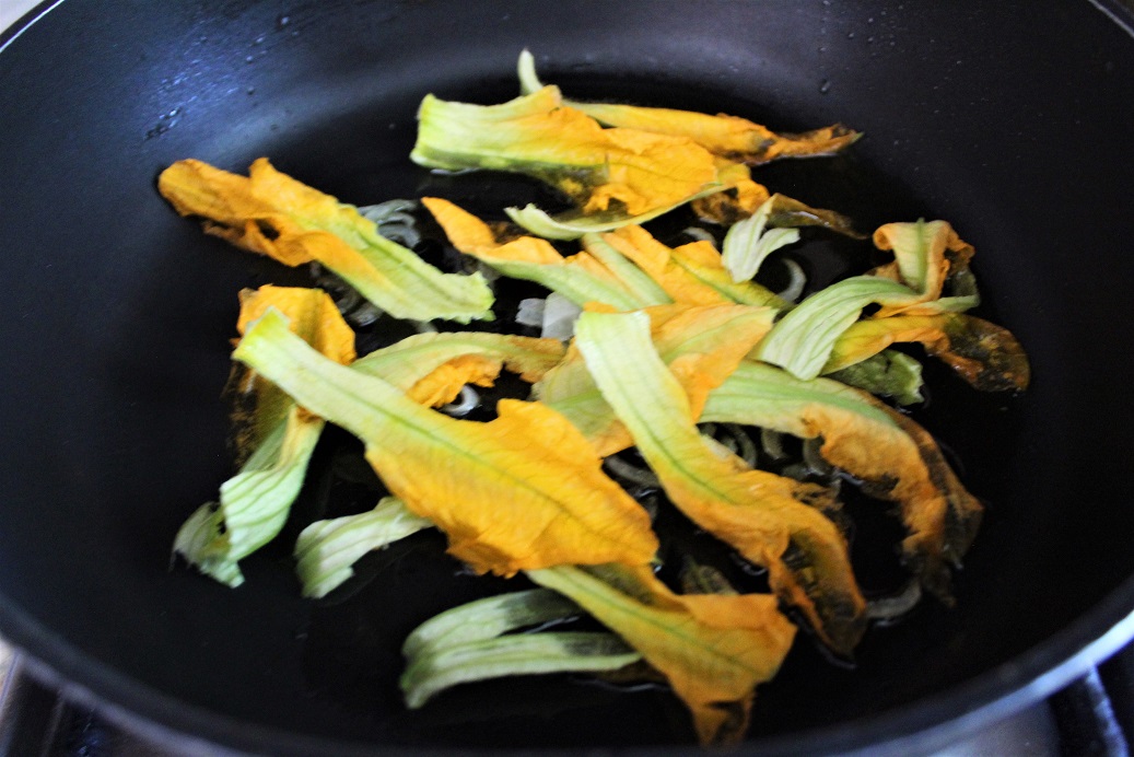 Preparazione: lavare ed asciugare delicatamente i fiori di zucca, privarli del pistillo e del gambo e tagliarli a striscioline.Far imbiondire in tre cucchiai d’olio la cipolla tagliata sottilmente.Aggiungere dunque i fiori di zucca, farli insaporire per due minuti, salare ed allontanare dal fuoco.