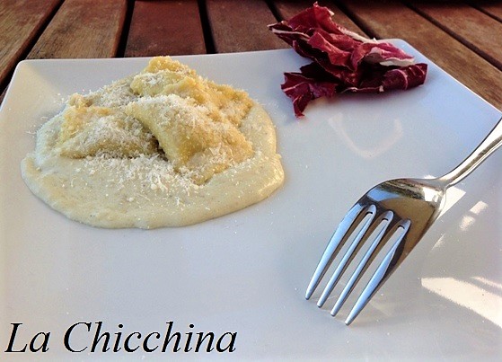 A volte mi lancio e, se lo faccio, esagero.Talvolta il risultato non soddisfa le mie aspettative, ma ogni tanto vengo ripagata della mia audacia; è successo così: andando in macchina e facendo zapping tra i vari canali radio, mi è capitato di sentire uno chef che descriveva la ricetta di ravioli (non al radicchio e robiola) su crema di patate. “Che bel titolo…” mi sono detta “…vuoi che io non ci provi?!”.Neanche arrivata a casa, mi sono messa all’opera: impasta di qui e trita di là, in relativamente poco tempo ecco i miei ravioli.Li porto a tavola e dopo un primo attimo di diffidenza sono, diciamo così, evaporati.Peccato che Natale sia passato, altrimenti sarebbe stato un primo perfetto.Però c’é Pasqua, ma chissà prima di allora quante me ne inventerò!!!Se volete vi spiego come preparare questa bontà!!